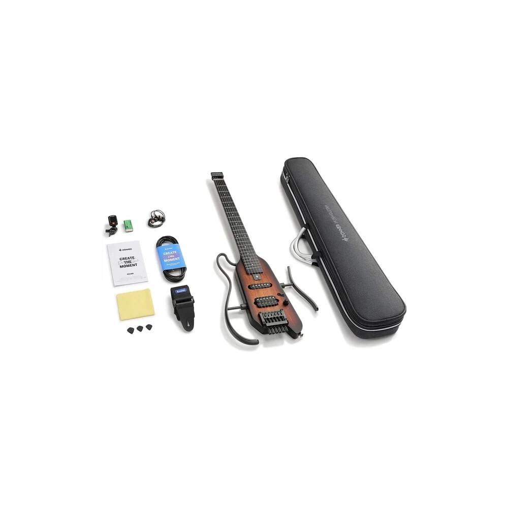 HUSH-X è una chitarra elettrica portatile, un concentrato di tecnologia studiato per coniugare prestazioni, comodità e portabilità. Incredibilmente leggera e compatta, HUSH-X è dotata di telai ergonomici a sgancio rapido per adattarsi in un attimo alle mutate condizioni di utilizzo. Fornita con gig bag, auricolari, tracolle, clip tuner, plettri e cavo, HUSH-X è alimentata con una batteria 9V in grado di fornire lunghe performace, siano sessioni in cuffia o veri e propri live.