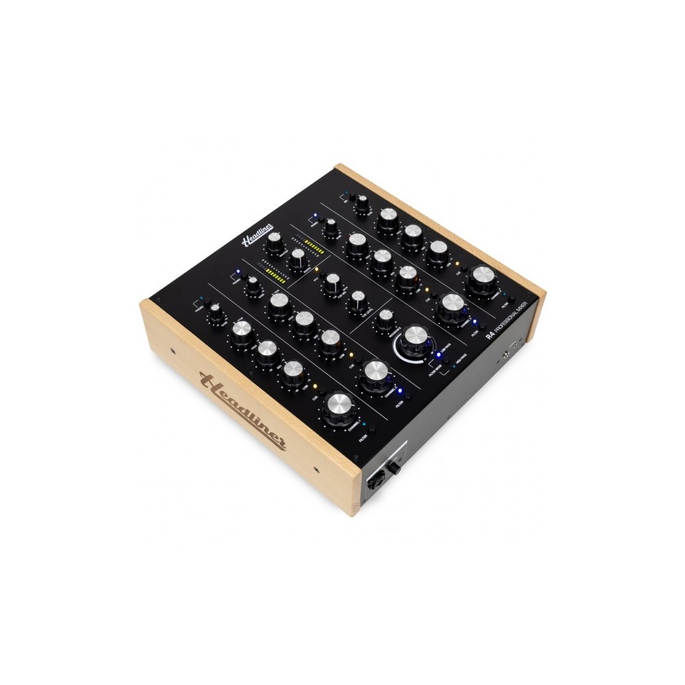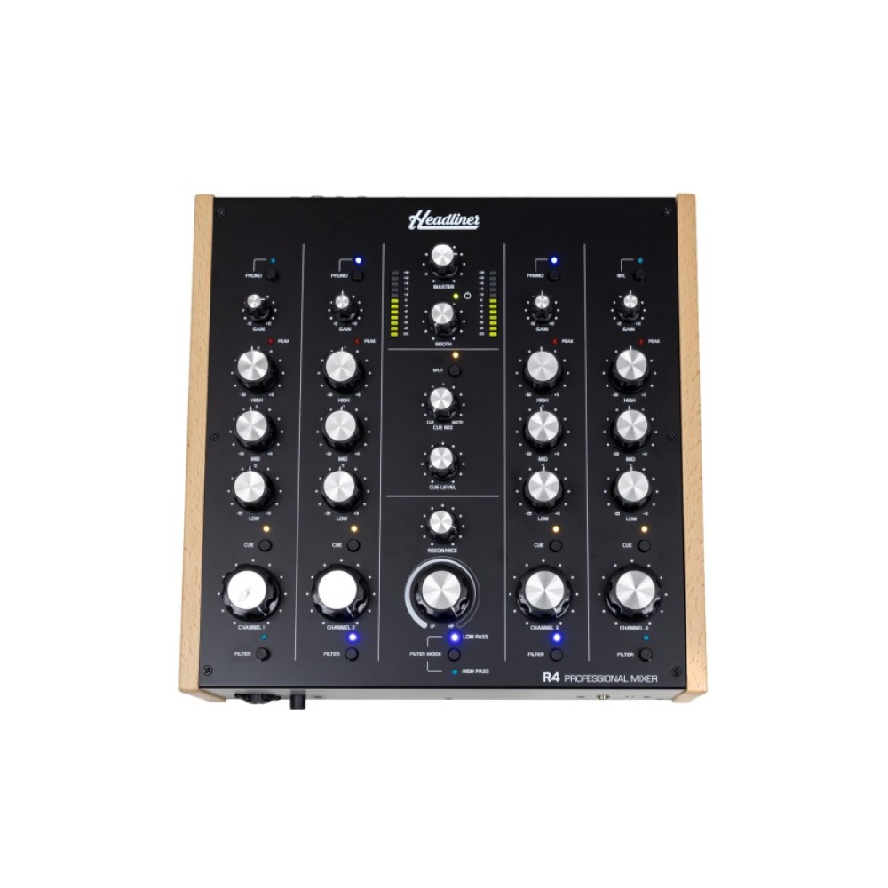 Ecco Headliner R4, un mixer rotativo analogico a 4 canali progettato per migliorare la tua esperienza da DJ. Continuando la tradizione di precisione, calore e convenienza, R4 è ricco di funzionalità avanzate e componenti di prima qualità, tra cui potenziometri ALPS originali, che garantiscono un'esperienza di mixaggio senza pari. Realizzato con quattro ingressi Line, tre ingressi Phono e un ingresso Mic su quattro canali stereo. Ogni canale vanta caratteristiche essenziali come il controllo del guadagno con LED di picco, un EQ isolatore a 3 bande, un selettore di cue per le cuffie, una generosa manopola del volume del canale e un interruttore di attivazione del filtro, che garantiscono ai DJ un controllo preciso sul loro suono. Il cuore dell'R4 è il canale Master, dotato di filtro analogico, monitoraggio delle cuffie e una sezione di controllo delle uscite completa. Passa senza problemi tra le modalità di filtro passa-alto e passa-basso con i controlli di frequenza e risonanza per dare forma al tuo suono distintivo. Offrendo ai DJ il controllo assoluto, la sezione di controllo Cue offre il controllo del volume delle cuffie, il controllo del mix (Cue/Master) e un interruttore di monitoraggio diviso per ottenere transizioni fluide tra le uscite. Dotato di potenziometri ALPS originali, un robusto involucro metallico e pannelli laterali in legno tinto, l'R4 trasuda un'estetica classica che completa qualsiasi configurazione DJ. La sua costruzione interna modulare e un alimentatore esterno collegato tramite un Mini XLR di bloccaggio garantiscono prestazioni audio superiori.