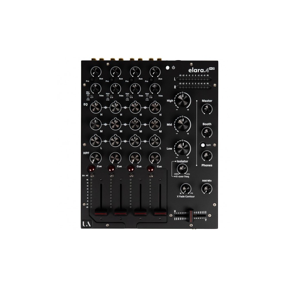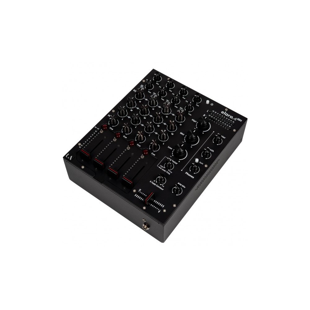 DJ mixer analogico a quattro canali, progettato e costruito in Inghilterra per chi è alla ricerca dei più alti standard in termini di prestazioni audio e artigianalità – combina una qualità audio eccezionale, controlli intuitivi e uno chassis robusto per offrire un'esperienza di mixaggio di livello professionale ai DJ che apprezzano sia la tradizione che l'innovazione – l’ELARA 4 Mk2 si distingue per il suo mix di calore analogico classico e design moderno – i quattro canali hanno ingressi phono e linea di alta qualità, garantendo una perfetta integrazione con una varietà di sorgenti audio – il layout ergonomico presenta fader lineari splendidamente bilanciati, controlli EQ precisi e un'interfaccia intuitiva, che semplificano la creazione di mix dinamici e coinvolgenti per i DJ – realizzato con meticolosa attenzione ai dettagli, l’ELARA 4 Mk2 utilizza solo i componenti più pregiati per garantire una riproduzione audio impeccabile e prestazioni affidabili. Il suo robusto telaio in metallo garantisce resistenza, mentre i componenti interni di alta qualità offrono il suono ricco e caldo che gli appassionati di musica analogica desiderano e cercano – la sezione di preascolto offre il monitoraggio pre-fader su ogni singolo canale, controlli split-cue e add-mix – ogni canale è dotato di un meter a 10 led e di un fader da 45 mm splendidamente pesato, con curva ultra lineare per un mixaggio preciso – un'esclusiva dell'ELARA 4 Mk2 è l'EQ/isolator master con controllo crossover variabile, progettato per completare l'EQ di ogni singolo canale e consentire una modellazione sonora altamente creativa - 2 ingressi phono/linea su ciascun canale, uscita master XLR bilanciata, uscite booth e aux con jack TRS da ¼", uscita rec con RCA, aux o insert master commutabili per una completa integrazione con effetti o unità esterne, ingresso microfonico con connessione XLR bilanciata – crossfader Innofader con contour variabile e routing selezionabile per canale tramite un interruttore a switch, che consente transizioni fluide e mixaggi creativi – che sia in un club, in studio o a casa, l’ELARA 4 Mk2 offre la versatilità e la qualità necessarie per esaltare i tuoi DJ set