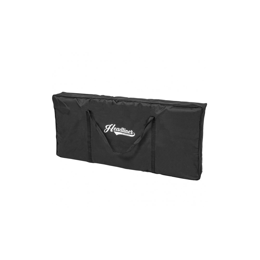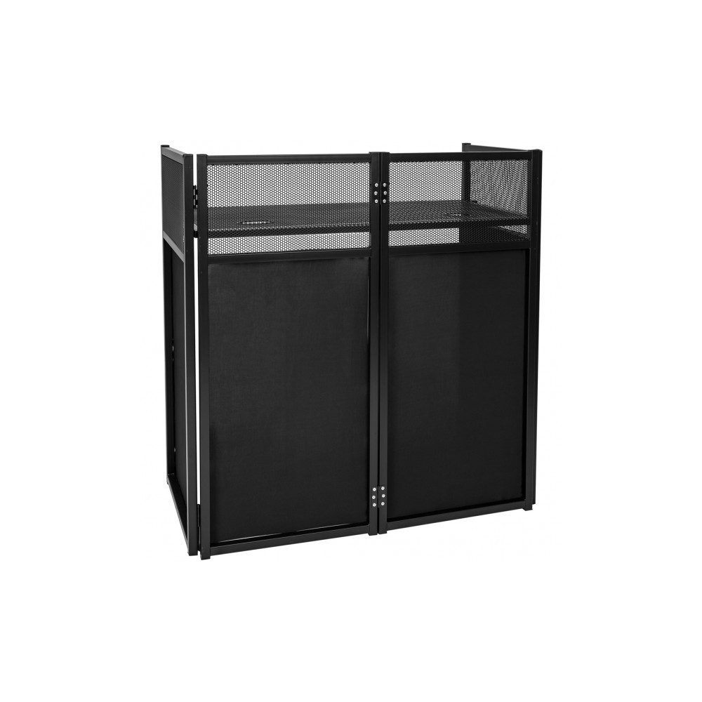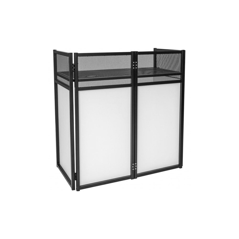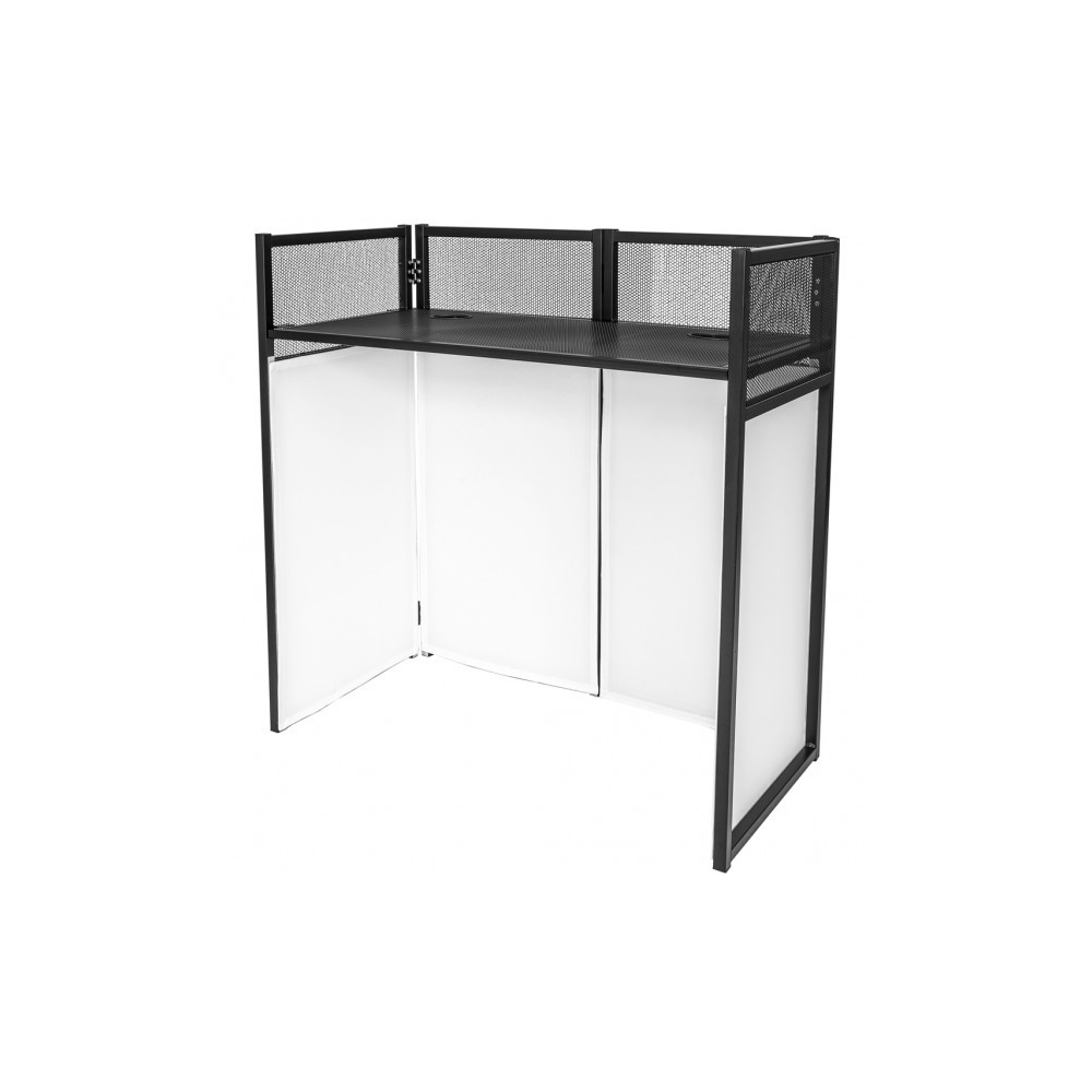 Dj booth completo e professionale per posizionare una consolle standalone o una consolle completa di lettori e mixer – al posto dei lettori è possibile posizionare due giradischi in versione battle (verticale) – la confezione comprende due teli elasticizzati (scrim), uno bianco e uno nero, oltre a una comoda borsa per il trasporto – gli scrim, in particolar modo quello bianco, possono essere retro-illuminati per proiettare pattern luminosi catch eye – il piano di appoggio è moquettato – si monta e smonta in 5 minuti
