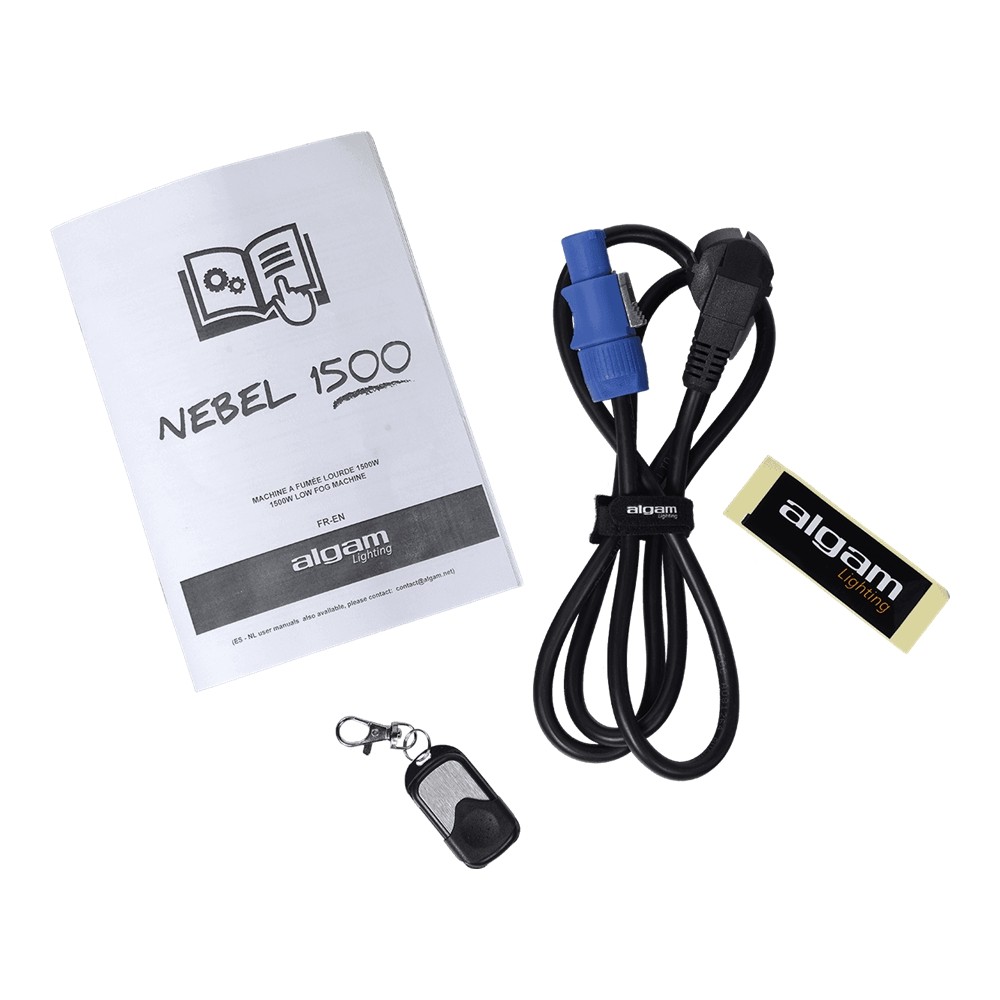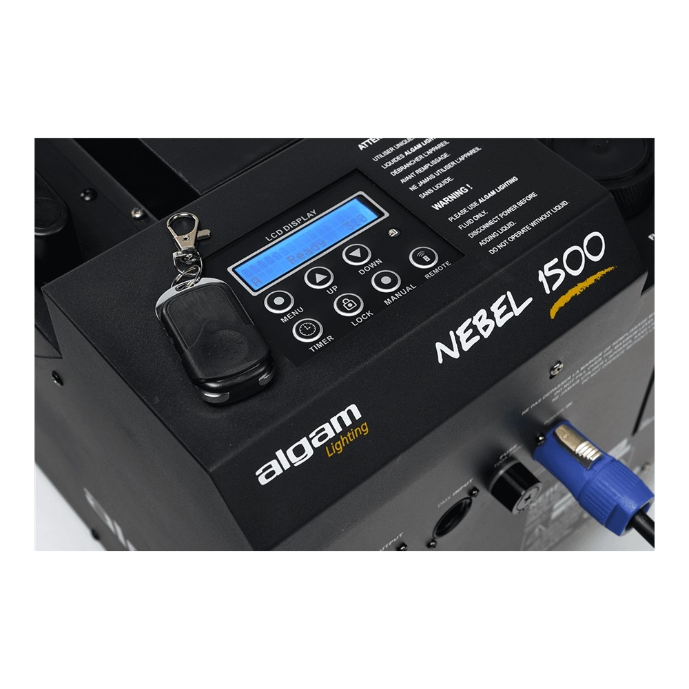 Il suo pannello di controllo consente diverse modalità e impostazioni (intervalli e durate di attivazione, timer automatico, intensità di proiezione e volume di emissione di fumo) facilmente programmabili tramite il display LCD. Alimentata da un connettore Powercon, la NEBEL 1500 dispone anche di telecomando DMX, per non parlare del telecomando HF che ti permetterà di attivare il fumo semplicemente premendo un pulsante.