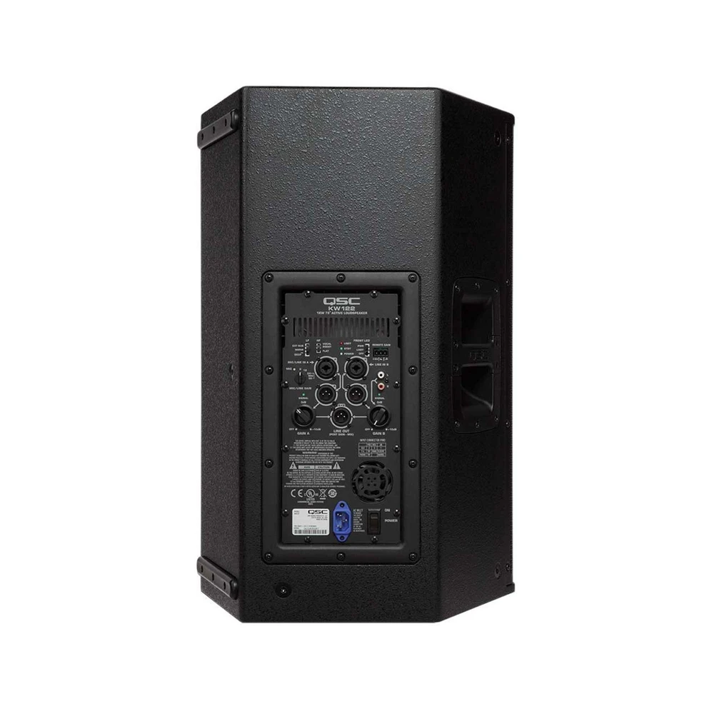 QSC KW122 è una cassa amplificata con un modulo di potenza da 1000 Watt in classe D (500W di picco sulle basse e 500W di picco sulle alte) che copre un range di frequenza che va da 50Hz a 20kHz e ha sul pannello posteriore tre ingressi audio, due Combo XLR / Jack ¼’’e uno stereo RCA. Due controlli di livello, uno per l’ingresso A e l’altro che controlla entrambi gli ingressi B e RCA. Il cabinet realizzato in betulla è robusto ma significativamente più leggero dei modelli precedenti.