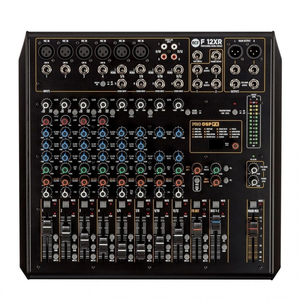 Inspirata alle unità analogiche professionali della Serie E, la nuova generazione di mixer RCF della Serie F offre un’elevata qualità sonora e la possibilità di scelta tra quattro formati compresi tra 6 e 16 canali. Un potente strumento per il musicista e l'appassionato, concepito e progettato interamente dal team R&D di RCF. Costruito in un robusto telaio in metallo, ciascun mixer mette a disposizione un flusso audio interamente bilanciato da ingresso a uscita, oltre ad un esclusivo processore PRO DSP FX: 16 effetti professionali, tra cui Riverberi (Hall, Room, Plate, Spring), Delay (Mono, Stereo e Multitap), Chorus, Flanger e Echo. I modelli F 10XR, F 12XR e F 16XR includono un'interfaccia audio USB, per la registrazione stereo su sistemi DAW su PC, e 2 canali per la riproduzione.