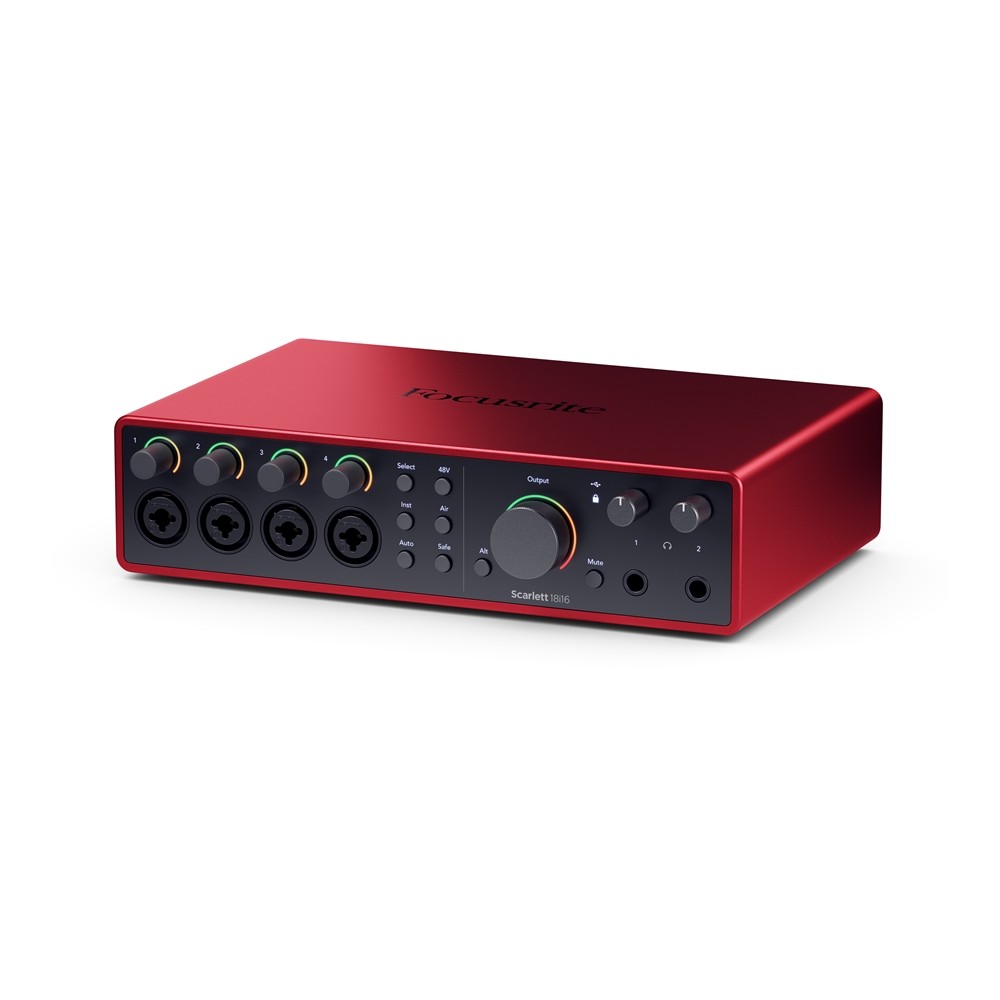 Interfaccia audio USB 2.0 con presa di tipo C; convertitori A/D-D/A a 24 bit/192 kHz. 4 ingressi combo con preamp (mic/Instrument/line), 4 ingressi e 4 uscite line Jack TRS, 2 uscite cuffia, In e out ADAT, In e Out S/PDIF. Ingresso e uscita MIDI DIN 5 poli. LoopBack In e Out. Dimensioni e peso: 240x169,4x60,5mm; 1,5KG.