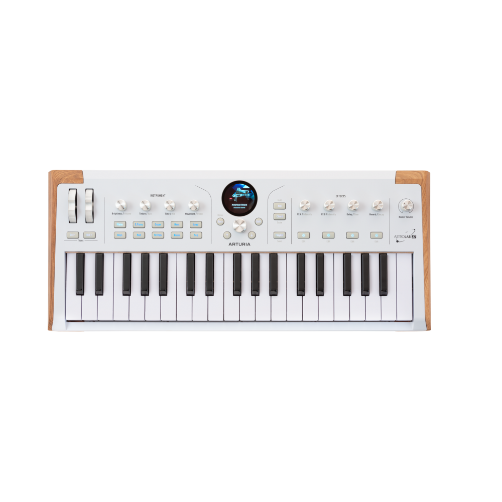 La Arturia Astrolab 37 è una tastiera progettata per offrire una combinazione ideale tra portabilità, risposta espressiva e potenza sonora, pensata per i musicisti che desiderano uno strumento compatto senza rinunciare a un suono di alta qualità. I suoi 37 tasti slim sensibili alla dinamica e dotati di aftertouch consentono un controllo preciso delle sfumature e della dinamica, mentre i numerosi motori di sintesi e gli oltre 1.800 preset permettono di spaziare dai classici pianoforti e organi ai synth più avanzati, includendo anche un vocoder integrato e funzioni creative come arpeggiatore, modalità accordi e scale. Con l’accesso a un catalogo di più di 10.000 suoni tramite V Collection e Pigments, offre un universo sonoro sempre pronto per ogni contesto creativo. L’integrazione con Analog Lab Pro e AstroLab Connect permette una gestione semplice e immediata dei preset, rendendo agevole personalizzare ogni suono in base alle esigenze del musicista. Il pannello di controllo è stato progettato per essere straordinariamente intuitivo e integra un display a colori che assicura una navigazione semplice e chiara in ogni contesto. La connettività completa — USB-C, MIDI I/O, ingresso mic/line, uscita stereo bilanciata, uscita cuffie e connessioni Bluetooth e WiFi — consente di integrarla facilmente in qualsiasi ambiente professionale. Leggera, resistente e pensata per accompagnare performance dinamiche, Astrolab 37 si conferma una soluzione affidabile per chi cerca versatilità, alta qualità costruttiva e sonora in un formato compatto dal look inconfondibile.